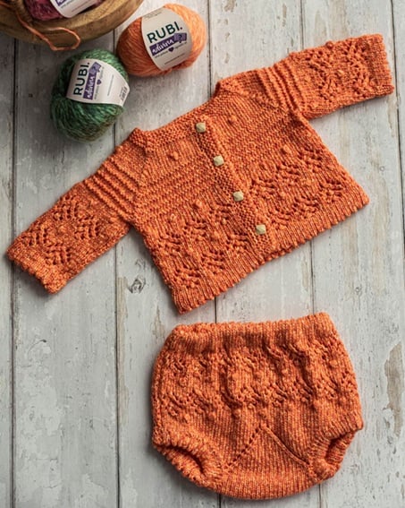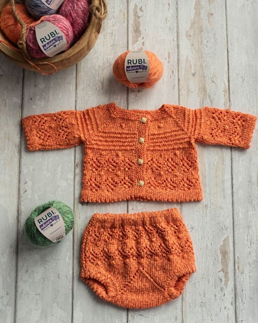 Para las prendas infantiles o de bebé, contar con un extra de calidez y suavidad es siempre un acierto, por lo que Rubí Adivina acompaña a este patrón de la mejor manera.