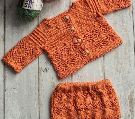 Este conjunto de rebeca y braguita infantil ofrece una combinación de puntos irresistibles. Los calados forman motivos geométricos y los bodoques añaden un toque de volumen y diversión al diseño. ¡Te divertirás mucho tejiéndolo!