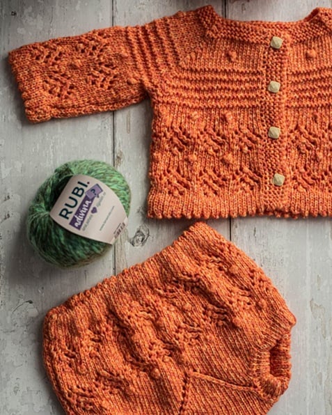 ¿Te animas a tejer este conjunto bebé a dos agujas? Descarga el patrón completo en nuestra web y comparte tu avance con #LanasRubi. ¡Nos encantará ver tu versión!